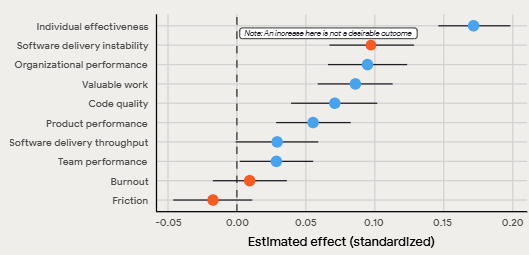 从数据上看,个体效率、代码质量和组织绩效显著提升,但与此同时,「软件交付不稳定性」也随之上升。
