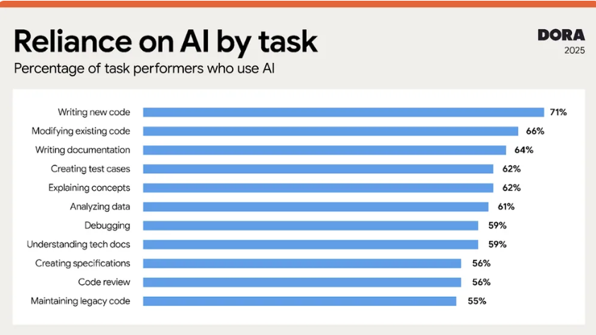 写新代码(71%)、修改已有代码(66%)、写文档(64%)、创建测试用例(62%)等都已成为AI的主战场。