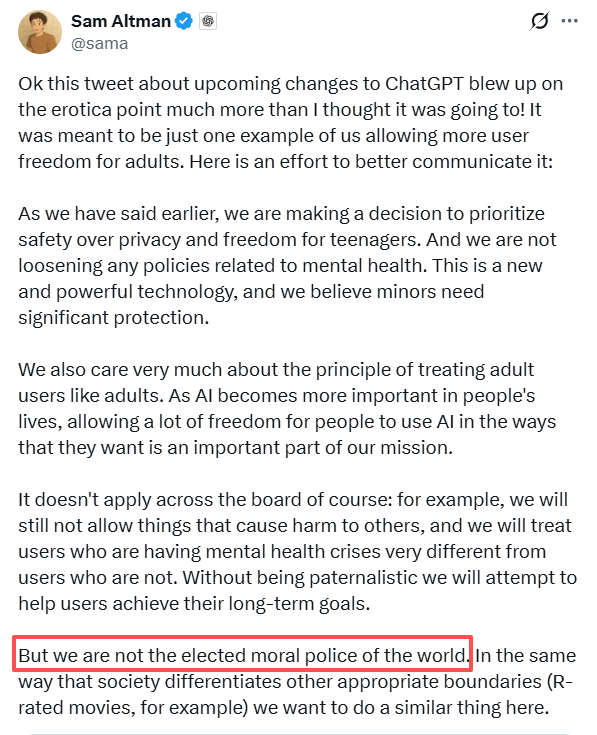 他在社交媒体上进一步上解释这一政策,强调OpenAI“高度重视将成年用户视为成年人的原则”,但同时承诺,仍会禁止“任何对他人造成伤害的内容”。