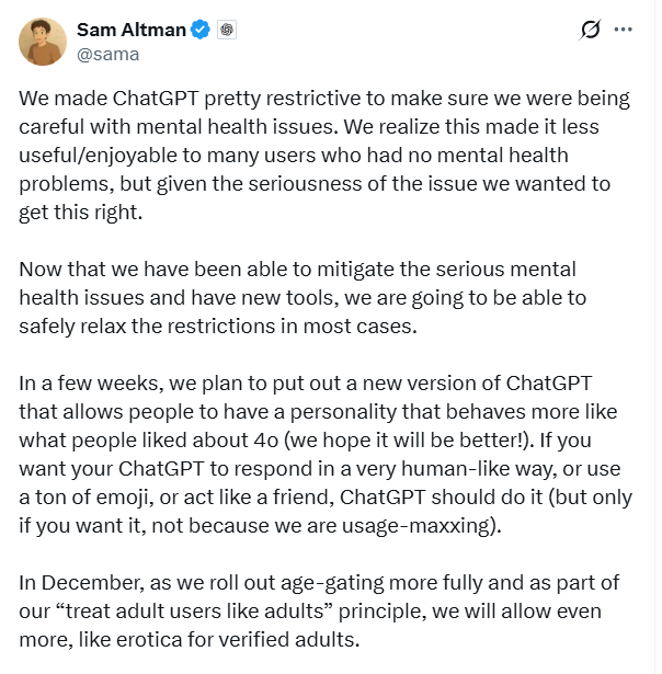 10月15日,OpenAI宣布成立一个由八名专家组成的委员会,旨在评估AI对用户心理健康、情绪与行为动机的影响。然而同一天,奥特曼却发文称该公司将放宽内容限制,两者在时间上的重合在社交媒体上引发困惑与强烈反弹。