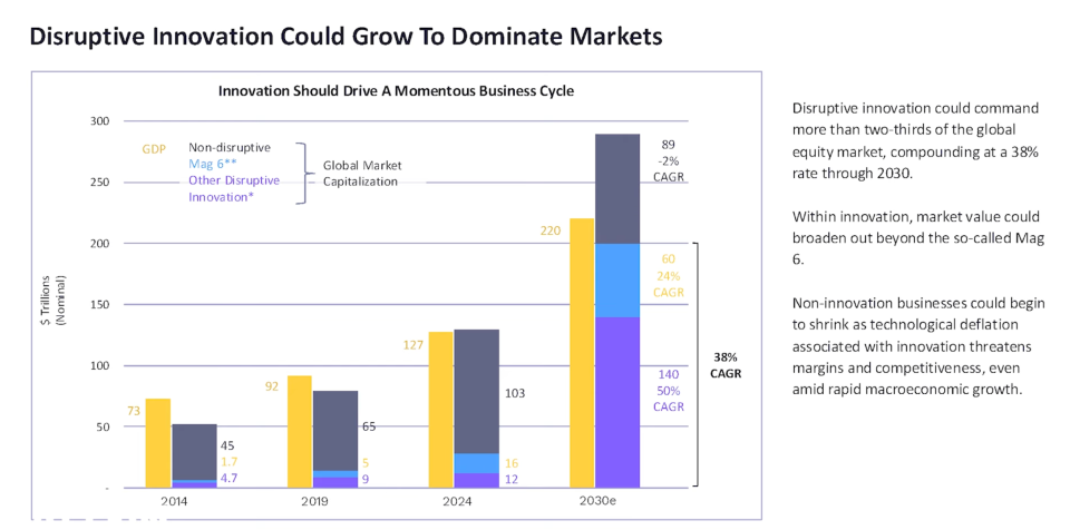 Cathie 进一步指出,在资本市场上,创新的价值仍被严重低估。她展示的估值图显示,2019 至 2024 年间,“Mag 6”(苹果、微软、谷歌、亚马逊、Meta 与英伟达)的总市值增长了三倍,而真正的颠覆式创新企业仅上涨 30%。她解释,这是风险偏好的集中效应:投资者在不确定性中转向巨头,忽视了潜在的技术杠杆。“过去五年,市场买的是确定性,不是未来。”