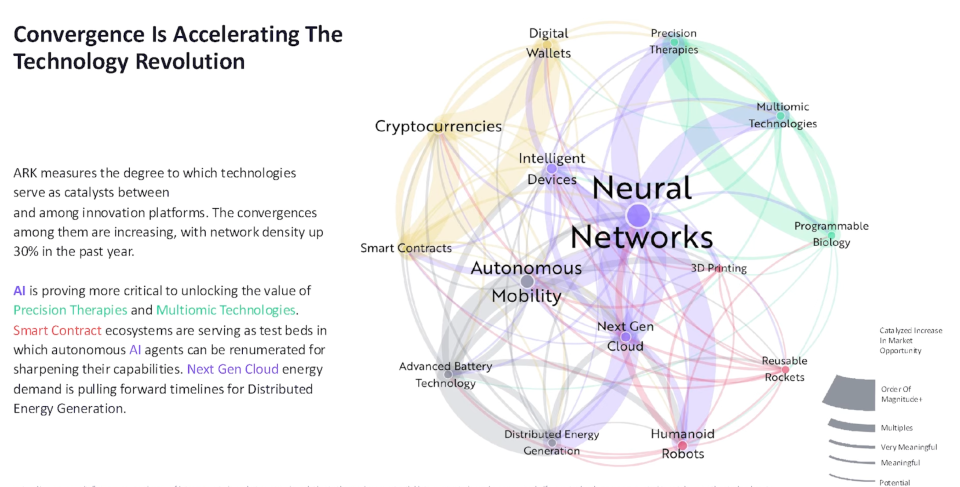 Cathie 反复强调,这场创新的关键不只是数量,而是速度。每一项新技术的成熟都在缩短另一项的研发周期,从而形成指数级的复利效应。她用一句话概括当下的时代精神:“历史上第一次,我们在同一时间见证五个平台、十五项技术同时进入爆发期。”