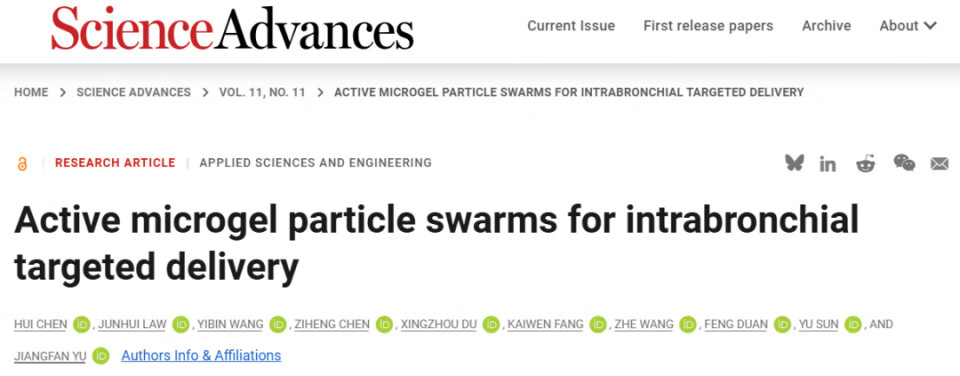 1.Chen,H. et al. Active microgel particle swarms for intrabronchial targeted delivery. Science Advances 11,11(2025). https://www.science.org/doi/10.1126/sciadv.adr3356