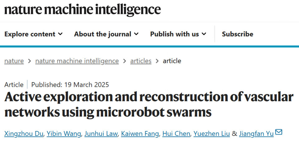 2.Du, X., Wang, Y., Law, J. et al. Active exploration and reconstruction of vascular networks using microrobot swarms. Nat Mach Intell 7, 553–564 (2025). https://doi.org/10.1038/s42256-025-01012-y