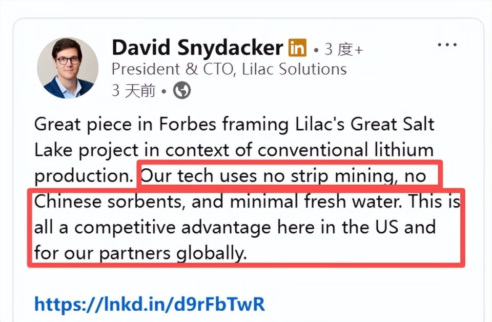 Lilac Solutions 的创始人大卫·斯奈达克(David Snydacker)甚至在领英主页直言:“我们的技术不使用露天开采,不使用中国吸附剂,只是用极少量的淡水,这对于我们在美国以及全球的合作伙伴来说都是一种竞争优势。”