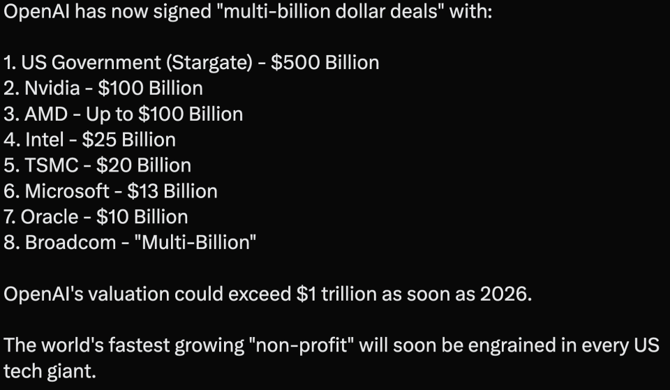 OpenAI的星门计划之上,正在构筑出全球芯片星际舰队:英伟达、AMD、博通、英特尔(通过英伟达),还包括ARM、三星、海力士等。