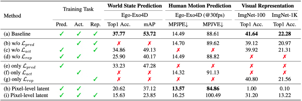 消融实验:为了验证各任务间的相互作用,研究团队对 EgoAgent 进行了系统的消融实验。结果表明,视觉表征、动作预测与世界预测三项任务相互支撑、缺一不可。当去掉其中任意一项任务时,其余任务的性能都会下降。相反,当三项任务在统一框架下联合优化时,模型在各项评估指标上均获得最优结果。这一现象表明,多任务的联合学习能够形成正向反馈机制:视觉任务提供感知语义,动作任务引导动态建模,而世界预测任务通过时间连续性约束整体的潜在空间。这种任务间的协同优化,使 EgoAgent 能够更稳定地捕捉感知 - 行动之间的关联,在整体表现上超越单任务模型。进一步的消融结果表明,在语义特征空间中进行学习的模型,在世界预测的准确性和视觉表征的有效性方面均显著优于基于像素级重建的潜空间建模。