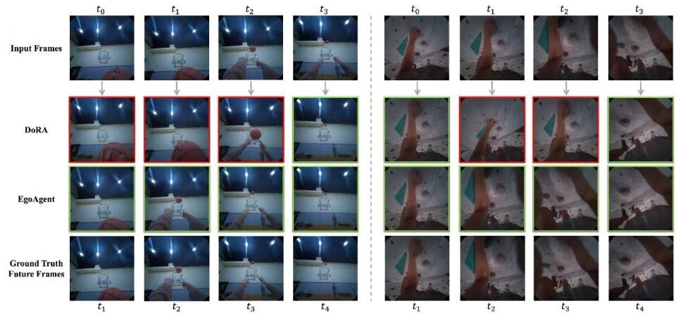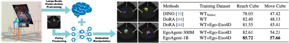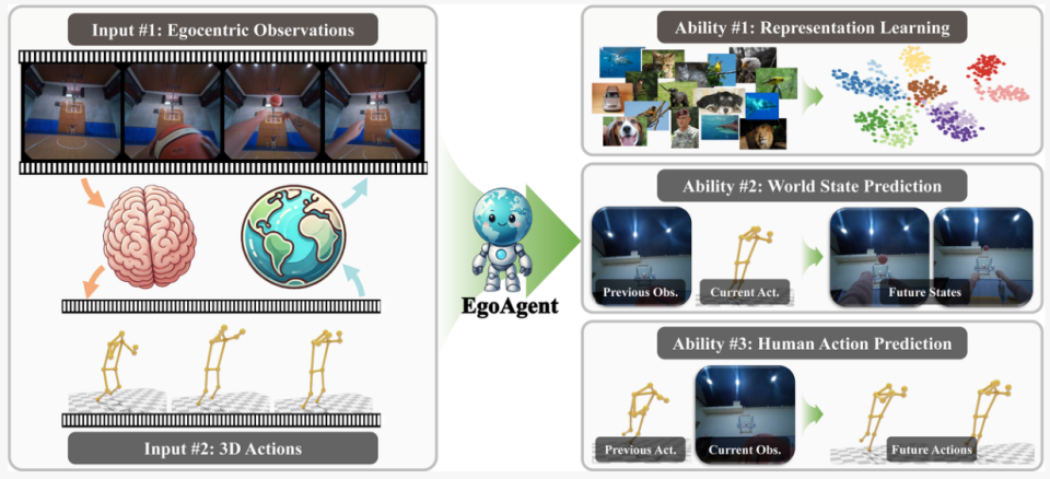 在认知科学中,这一系统的形成机制被称为具身认知(Embodied Cognition)与共同编码理论(Common Coding Theory):感知与行动不是相互独立的过程,而是在共享的表征空间中协同工作、相互强化。EgoAgent 正是受到这一机制的启发。它旨在模拟这种人类大脑、身体和环境之间持续的互动,使得 AI 能够像人类一样学习 —— 不是仅仅通过观看图片,而是通过亲身经历世界,去预测未来、采取行动,并理解行动如何改变环境。