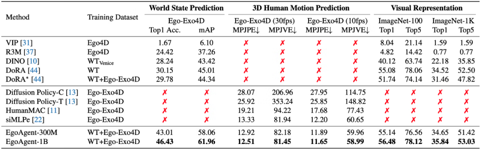 EgoAgent 在三项关键任务上均取得了优异表现,而现有模型通常仅能在其中一至两项任务上实现有效学习。