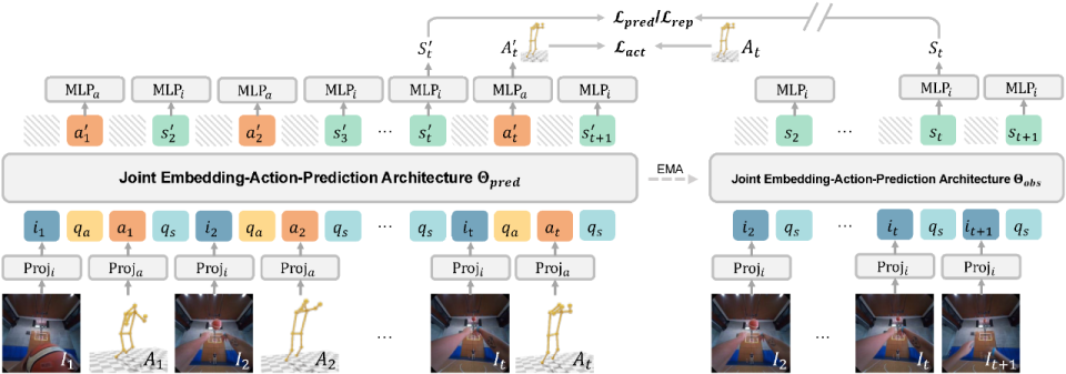 为此,研究团队设计了一个名为 JEAP(Joint Embedding-Action-Prediction)的核心架构。该架构基于联合嵌入预测架构世界模型(JEPA World Model)进行扩展,对其中的 teacher–student 框架进行了创新改造:在保留 JEPA 自监督预测条件表征的能力基础上,进一步引入对世界状态和三维人体动作的多模态自回归预测,使模型能够在一个统一的 Transformer 框架内,同时学习三项任务。JEAP 的核心设计包括: