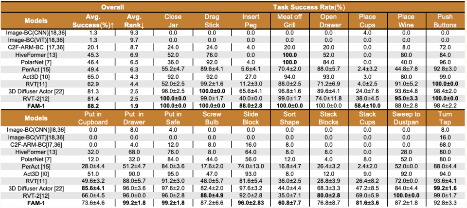 例如,在 RLBench 上,FAM-1 可以取得 88.2% 的操作成功率,远远超过 RVT-2、Act3D、3D Diffuser Actor 等 SOTA 模型 6% 以上,特别是在 “Insert Peg”、“Open Drawer”、“Sort Shape”、“Door Close”、“Hammer Strike” 等任务上成功率大幅领先,平均成功率大幅提升了 30% 以上。