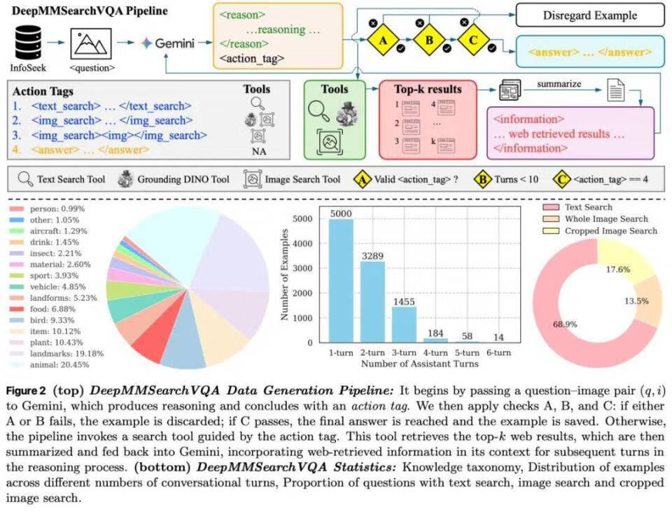 一是提出新的数据集 DeepMMSearchVQA。该数据集包含多样化多跳视觉问答样本,并以多轮对话的形式呈现。它在不同知识类别之间保持平衡分布,涵盖了既需要搜索又无需搜索的问题类型。