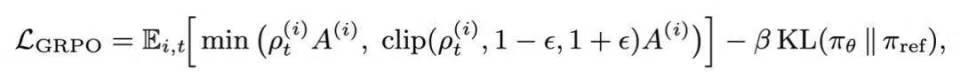 该阶段的训练目标通过带截断的重要性加权代理进行优化,这虽与 PPO 类似,但引入了组相对优势的概念。其数学形式可表示为: