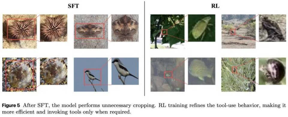 另外,SFT 模型有时会在不必要的情况下执行裁剪图像搜索,而 RL 模型能够纠正此类错误,如图 5 所示。这一现象进一步印证了 RL 在优化工具使用行为、提升使用效率方面的重要作用。