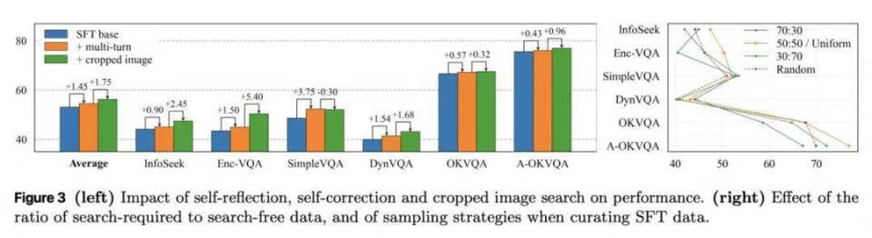 裁剪图像搜索以及蒸馏得到的自我反思与自我纠正能力可以显著提升模型性能。苹果在图 3(左)中展示了启用多次文本搜索与裁剪图像搜索能力所带来的效果。SFT 基线模型指的是仅使用整图搜索并进行单次文本搜索调用的设置。可以看到,随着自我反思与自我纠正机制的引入与蒸馏,模型整体性能得到了提升。