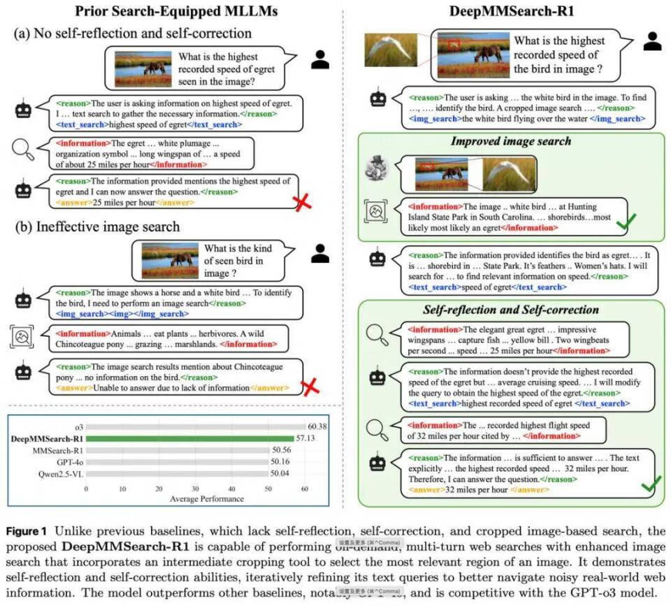 在现实世界的应用中,MLLM 需要访问外部知识源,并对动态变化的现实世界信息进行实时响应,从而解决信息检索和知识密集型的用户查询。当前的一些方法,比如检索增强生成(RAG)、search agent 以及配备搜索功能的多模态大模型,往往存在流程僵化、搜索调用过多以及搜索查询构造不当等问题,导致效率低下以及结果不理想。