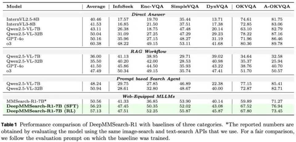 苹果表示,配备网络搜索功能的多模态大语言模型在性能上显著优于 RAG 工作流和基于提示的搜索代理基线模型。如表 1 所示,DeepMMSearch-R1-7B(RL)相较于 RAG 工作流和基于提示的 search agent 分别取得了显著的 + 21.13% 和 + 8.89% 的性能提升,同时在整体表现上与 OpenAI o3 相当。
