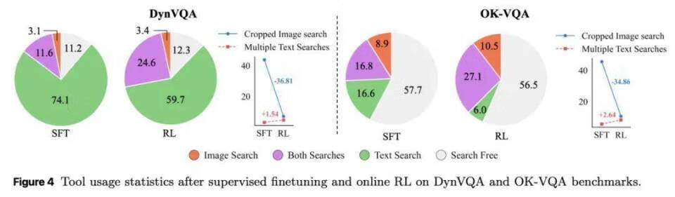 模型的工具使用行为与各数据集的特性保持了一致:在 DynVQA 中,模型在 87.7% 的样本上调用了工具;而在 OKVQA 中这一比例为 43.5%。