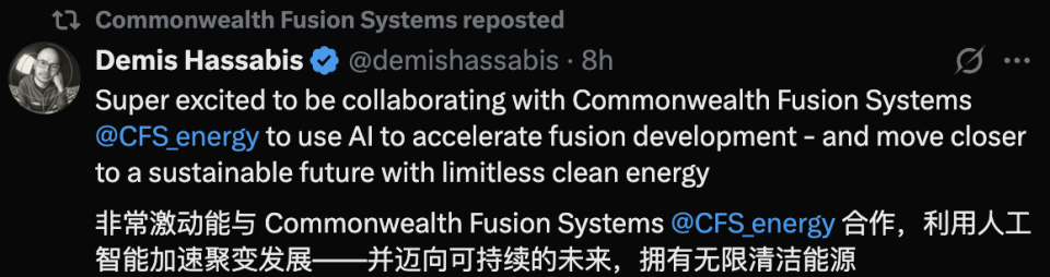 诺奖得主、Google DeepMind联合创始人兼CEO Demis Hassabis在X平台激动表示,与CFS的合作将加速核聚变发展,推动人类迈向可持续的未来,拥有无限清洁能源。
