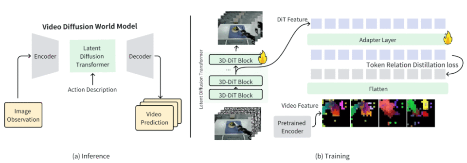 视频扩散世界模型概览。(a) 推理阶段:一个潜空间扩散 Transformer 根据图像观测与基于文本的动作描述来预测未来帧。(b) 训练阶段:通过 DINO 特征对扩散 Transformer 的中间表征进行监督,采用特征关系蒸馏损失来提升模型的时空建模能力。