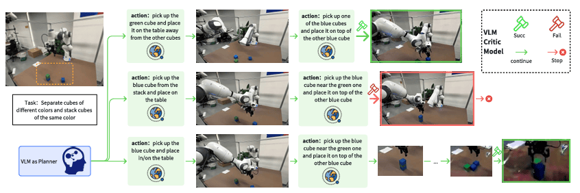 通过世界模型仿真的 VLM 规划自我校正。(a) 我们的迭代循环机制:VLM 规划器首先提出一个动作方案,世界模型随后模拟其未来帧,接着由 VLM 评论器(critic) 对结果进行评估并提供反馈,从而使规划器能够优化下一步决策。 (b) 生成的示例:上图展示了一个成功的规划结果,而下图展示了检测到失败后的重新规划触发过程。