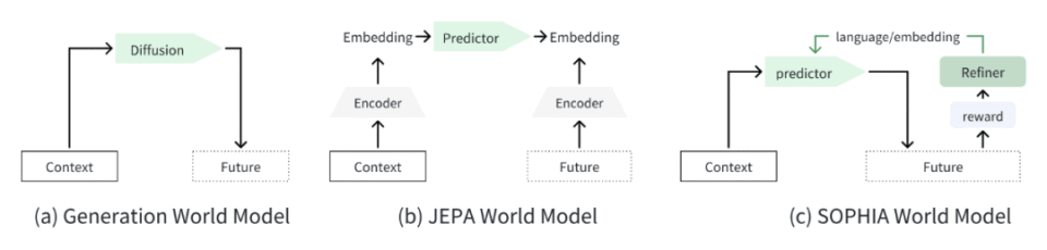 比较了三种框架的核心机制:(a) Diffusion 模型:从输入上下文生成未来帧;(b) JEPA 模型:学习在嵌入空间中的预测一致性;(c) SOPHIA: 首先由 预测器从上下文生成未来;接着由 评估器对结果进行打分,产生奖励信号;然后由 修正器基于奖励和外部语言 / 嵌入反馈发出纠正信号;整个系统通过这种方式进行循环优化。
