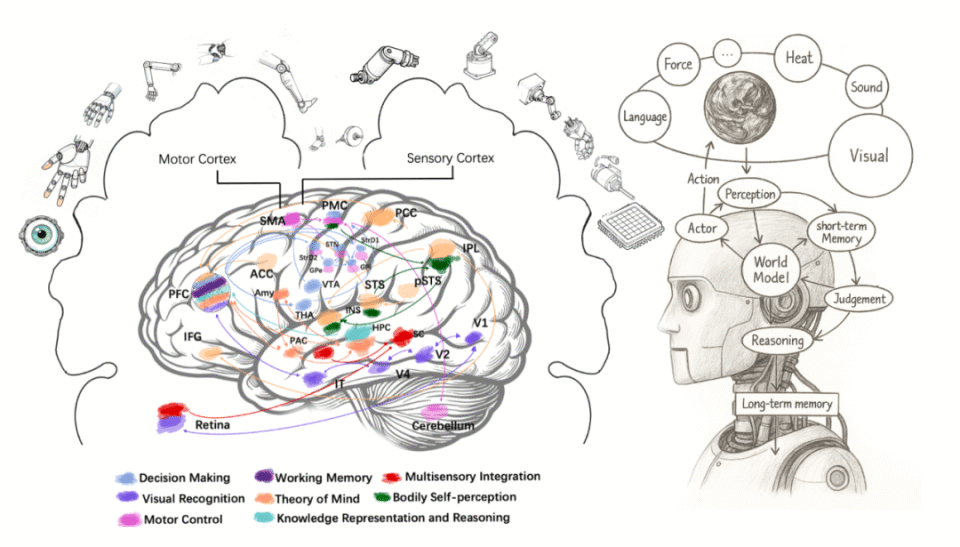 具身智能体与世界模型的体系结构:一个智能体通过多种感知输入(例如视觉、听觉、热觉、力觉等)来感知外部环境。 这些感知信号由世界模型进行处理,构建出一个关于环境的内部预测表征。模型的预测结果以及保存在短期记忆与长期记忆中的过往经验,将为其推理与判断提供依据。在此基础上,执行体根据内部模拟生成相应的动作,以操纵真实世界。这种闭环系统使智能体能够:学习环境的动态规律;进行未来的规划与预判;并最终完成复杂的目标任务。