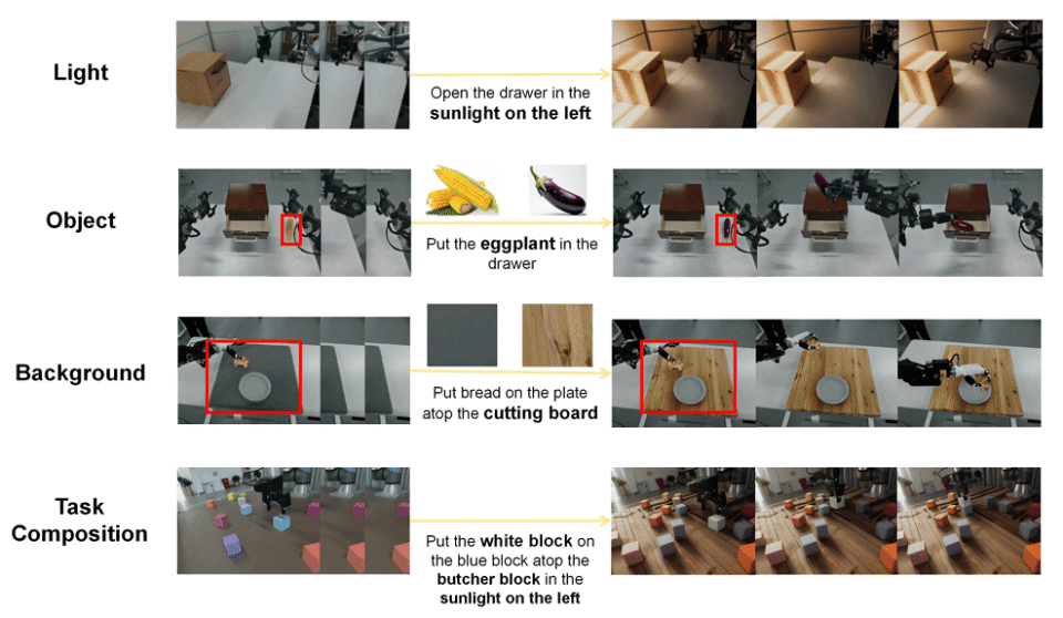 换句话说,WoW 让 AI 拥有了真正的 “自我造数” 能力 —— 它不再完全依赖昂贵的人力采集,而能依靠世界模型的物理推理与想象能力,持续扩展自己的学习边界与世界认知。结果表明,这种组合增强能有效模拟真实世界中自然出现的变化,提高 VLA 模型的泛化能力。