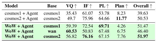 下面实验结果,说明 WoW 的 “自我优化循环 SOPHIA 范式” 使模型能从推理 — 生成 — 反思的闭环中不断改进,区别于传统仅追求视觉保真度的视频生成模型。