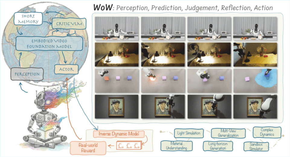 WoW 是一个能「想象世界 → 理解物理 → 生成视频 → 执行动作 → 再学习」的闭环大模型。