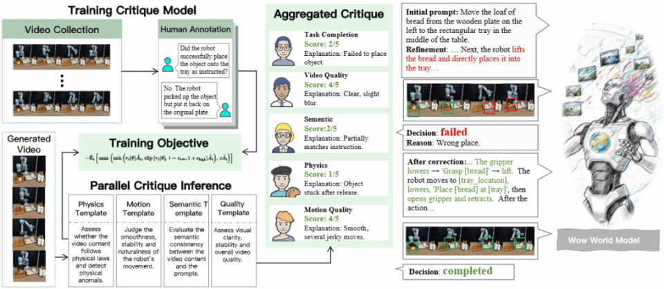这种过程认知闭环的反思式学习 “想象 — 验证 — 修正 — 再想象”,正是人类智能的核心特征。WoW 的 SOPHIA,让大模型具备了这种能力。在核心层面,WoW 遵循 SOPHIA 范式 —— 将大语言模型与扩散 Transformer 结合起来,在语言引导下生成物理上合理的未来, 通过 “生成预测 — 批评 — 修正” 的迭代循环机制,WoW 将 “想象” 与 “推理” 统一为具身智能的基本组成部分。