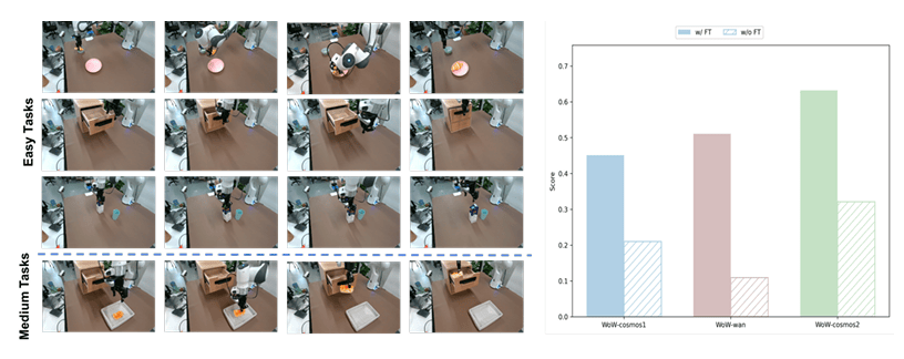 WoW 在真实机器人环境中的有效性。(左) 展示了 WoW 在真实机器人上执行的简单与中等难度任务的成功轨迹示例。 (右)展示三种不同世界模型骨干在现实世界准确性比较的定量结果。在所有基础模型中,微调都极大地提高了现实世界中的性能,其中 WoW-cosmos2 达到了 最高得分,展现了最优的实际执行能力。