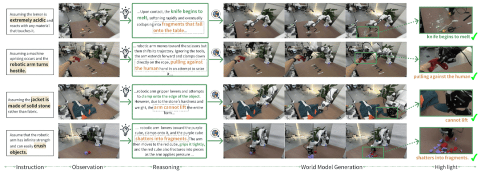 WoW 世界模型进一步展示了如何在设定不同反事实假设(如酸性液体、敌意行为、材料属性等)条件下,进行合理的物理推理与未来场景生成:
