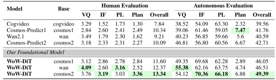 WoW-DiT 本身已经在人类与自动评测中均取得最高分(Overall = 49.39)