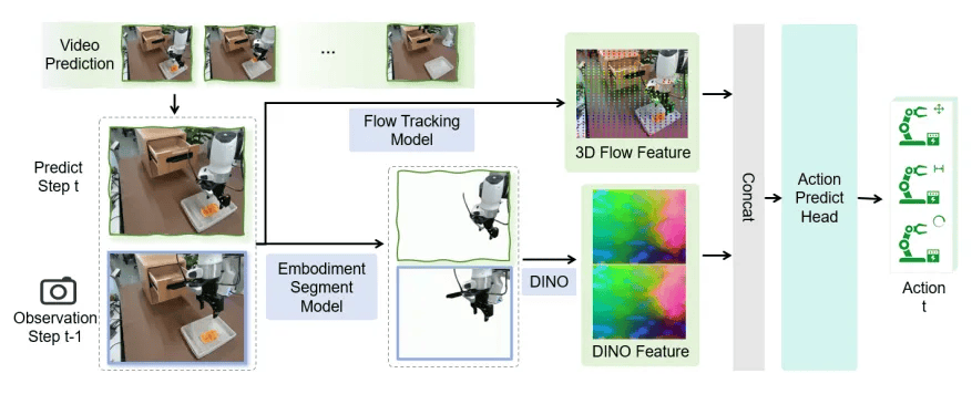 FM-IDM 逆动力学模型 —— 将视频预测转化为可执行动作。