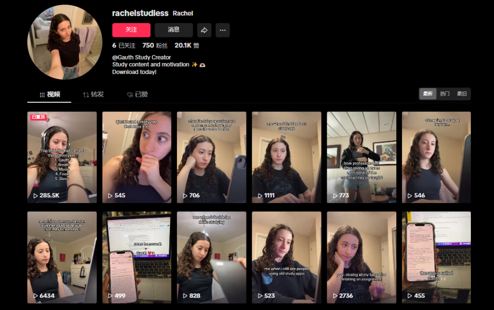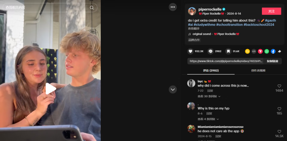 图 | 千万粉丝大博主为Gauth拍摄营销视频瑞秋和不少同学都是从TikTok上了解到中国教培AI的。下载后,为了赢得免费使用奖励,她们持续不断地发布自己的使用视频。