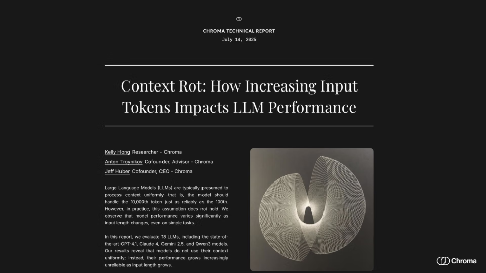 Kelly Hong 的研究则为「长上下文万能论」敲响了警钟。她提出了「上下文腐烂」现象:随着输入上下文的增长,尤其是在存在模糊信息和「干扰项」时,大模型的性能会显著下降,甚至在简单任务上也变得不可靠。这证明了精巧的上下文工程和精准的检索比简单粗暴地填充上下文窗口更为重要。