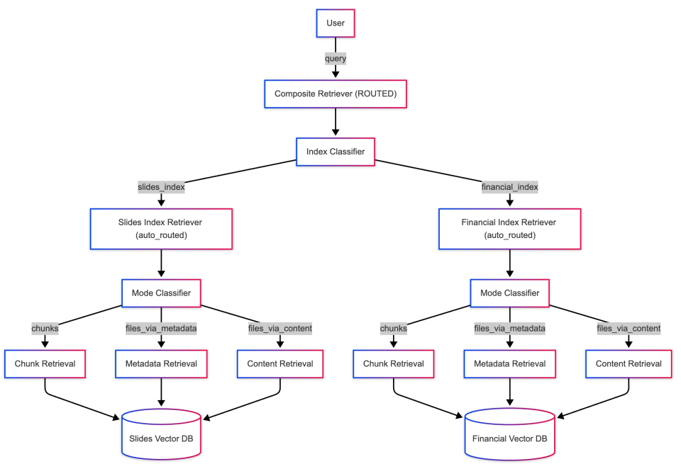 例如,当查询「2024 年第四季度财报中的收入增长情况如何?」时,顶层 agent 会识别出「财报」关键词,并将查询路由至 financial_index。