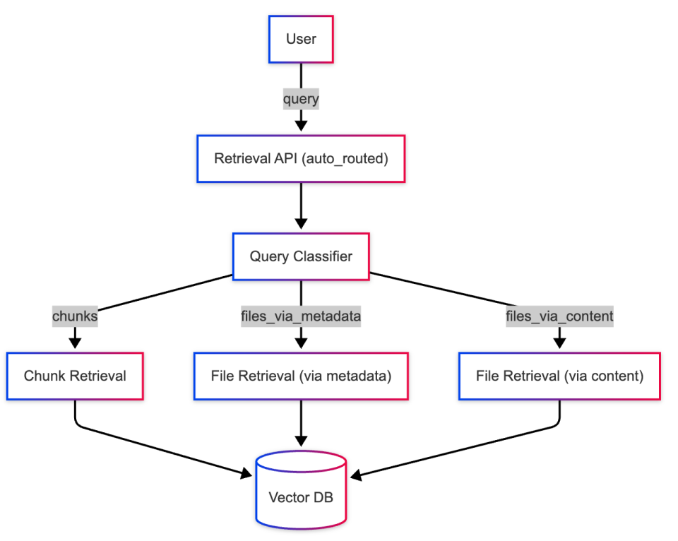 在实际应用中,系统通常无法预知用户会提出哪种类型的问题。为了解决这个问题,作者介绍了一种名为「自动路由」(auto_routed)的检索模式。