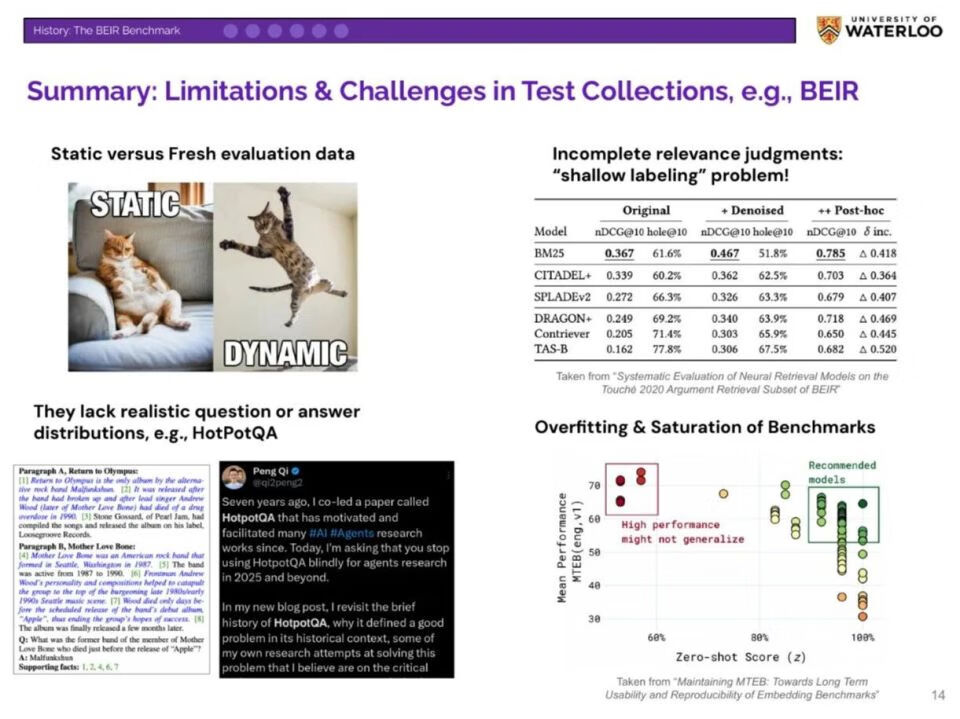 Thakur 则颠覆了传统的评估体系。他认为,像 BEIR 这类为传统搜索引擎设计的基准,其目标是「找到排名第一的正确答案」,这与 RAG 的目标不符。