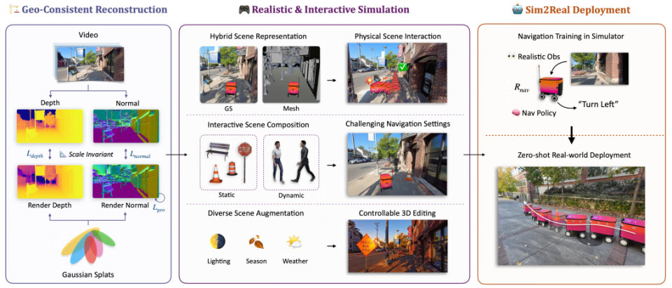 在该实验室最近的工作中,研究人员利用 Coco Robotics 赠予实验室的送货机器人小车做了相关研究工作。例如,发表在 CVPR 2025 的论文《Vid2Sim:基于视频的逼真交互式城市导航模拟》(Vid2Sim: Realistic and Interactive Simulation from Video for Urban Navigation)[3]。通过拍摄一段视频,可将其重建成一个交互式环境,然后在该环境中训练 Coco 小车,进而能够直接在现实生活中部署。结果显示,Vid2Sim 显著提高了数字孪生和现实世界中的城市导航性能,成功率分别提高了 31.2% 和 68.3%。