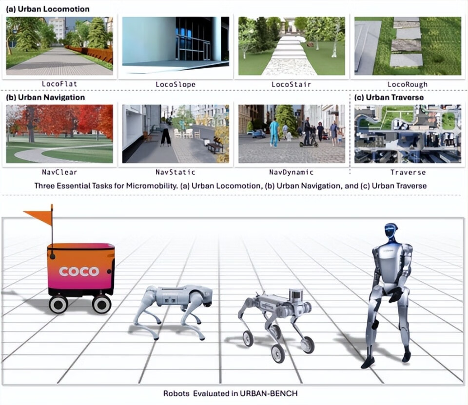 在另一项发表于 CVPR 2025 的论文《通过可扩展的城市模拟实现自主微移动》(Towards Autonomous Micromobility through Scalable Urban Simulation)中 [4],也研究了人行道机器人。研究人员利用 AI 代理协助人类操控小型出行设备(micromobility),为提升安全性和效率提供了一种可行的解决方案。他们构建了一种高性能机器人学习平台 URBAN-SIM,用于在交互式城市场景中大规模训练具身代理。此外,他们还针对四种机器人设计了涵盖 8 个场景的三项任务,包括轮式机器人(Coco Robotics 的送货机器人)、四足机器人(Unitree Go2)、轮腿机器人(Unitree B2-W)和人形机器人(Unitree G1)。