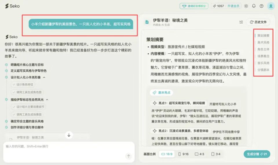 在实测体验时,当智东西输入“小羊介绍新疆伊犁的美丽景色,一只拟人化的小羊羔,超写实风格”的提示词,其就会生成策划摘要、美术风格、角色主体、场景概念、音乐风格、分镜剧本。