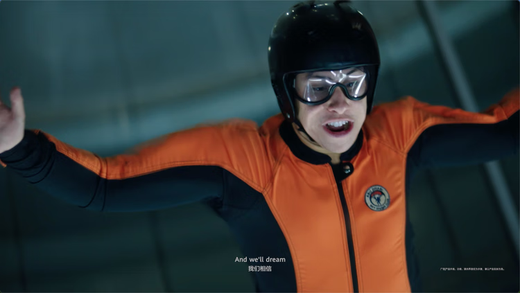 海惟:对,其实这个品牌片你也能看得出来,它其实摒弃掉了之前的一些传统的一些叙事,就比如说一些大男主、大女主的叙事,我想要什么我就一定能成功。但这个品牌片传递的就是我追逐这个东西的过程是最重要的,我在风洞里面去找到了一个飞翔的感觉。这个东西其实是跟以往的宣传片非常大的不一样的一个点。我也非常喜欢里面的一句话,就是”The past is everything we were don't make us who we are”。就是我们要更好的去拥抱现在当下的这个状态。