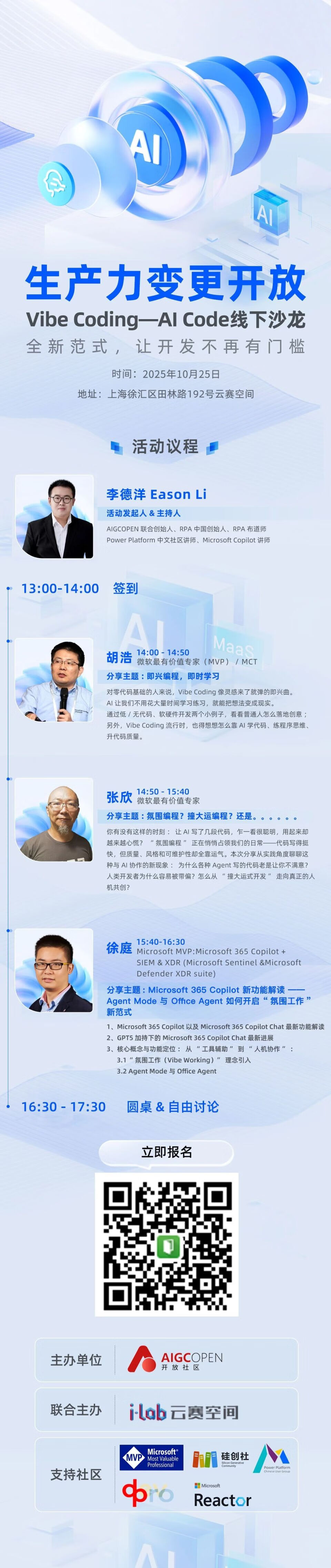 为助力开发者深入理解 Vibe Coding 核心逻辑,高效掌握其在实际场景中的应用方法,10 月 25 日,由AIGC开放社区主办的「Vibe Coding—AI Code 线下沙龙」将在上海云赛空间开启。本次活动邀请多位微软 MVP 嘉宾,从原理拆解到应用实战,再到自由开放的圆桌讨论,一起解锁AI 开发新玩法,零基础也能轻松融入,现场氛围超轻松,等你来 happy!
