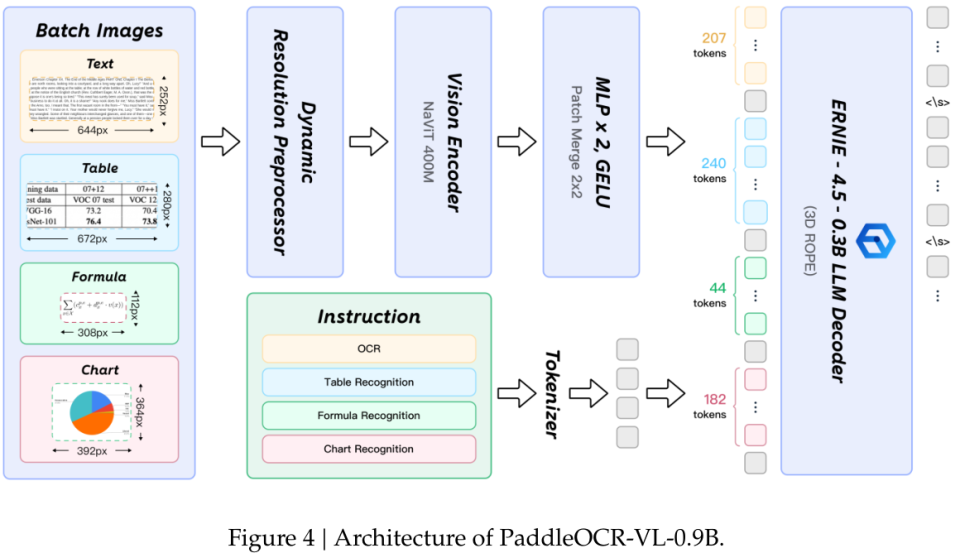 等第一阶段的布局分析搞定,拿到了页面上所有元素的位置坐标和阅读顺序后,才轮到第二阶段的主角,也就是那个0.9B参数的核心视觉语言模型PaddleOCR-VL-0.9B登场。