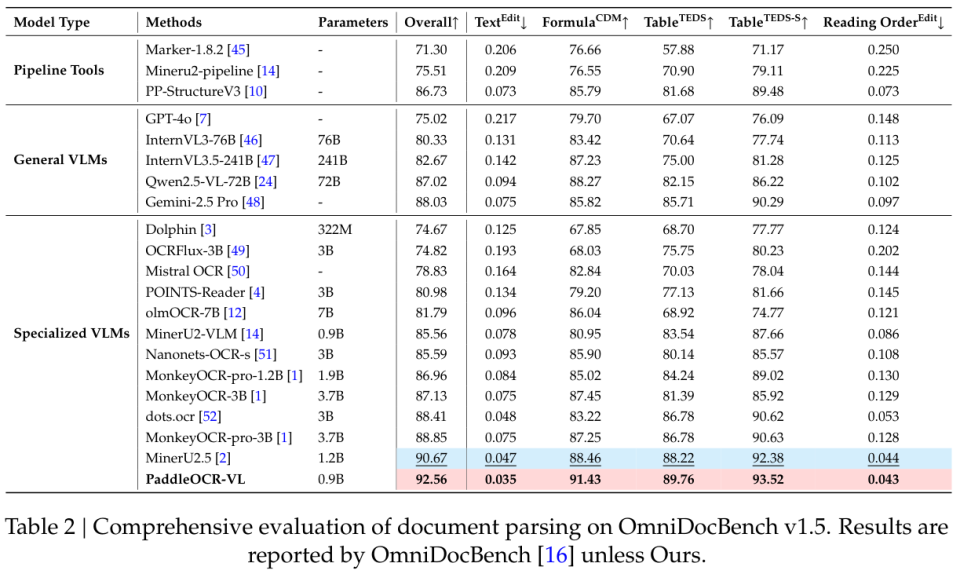 可以看到,无论是和传统的管道式工具(如PP-StructureV3),还是和参数量大得多的通用视觉语言模型(如谷歌的Gemini-2.5 Pro,阿里的Qwen2.5-VL-72B),以及其他专门做文档解析的专业模型(如MinerU2.5,dots.ocr)相比,PaddleOCR-VL的综合得分都是最高的。