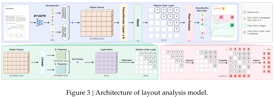 这个布局模型本身也是个组合体。它先用一个基于RT-DETR的检测模型,快速检测和分类页面上的各种元素。然后,再用一个非常轻量的,只有6个Transformer层的指针网络,来专门预测这些元素之间的阅读顺序。为了让顺序预测得更准,它还借鉴了Relation-DETR的几何偏置机制,这个机制能让模型明确地理解元素之间的空间位置关系,比如“A在B的左边”,“C在D的上面”,这种几何关系对于判断阅读顺序至关重要。最后,通过一个确定性的解码算法,就能生成一个拓扑一致,也就是完全符合逻辑的阅读顺序。