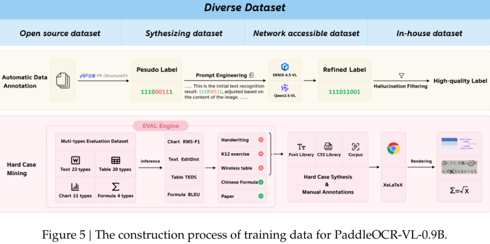 正是通过这种开源,合成,网络抓取和内部积累相结合的数据构建策略,以及自动化标注和困难案例挖掘的精细化运营,才为PaddleOCR-VL的强大性能打下了最坚实的基础。