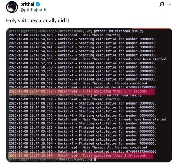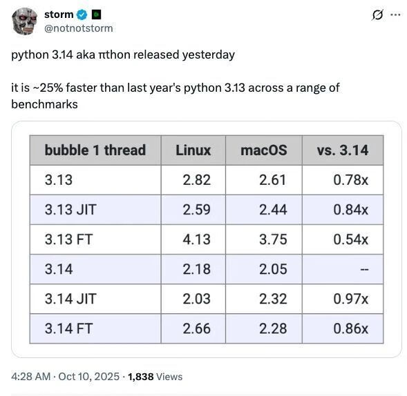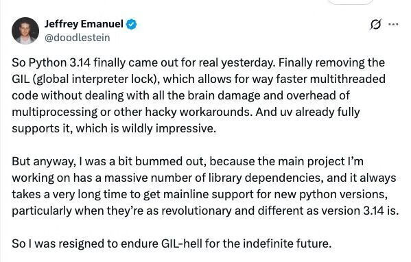 开发者 Jeffrey Emanuel 写道,“Python 3.14 终于真的发布了。终于移除了 GIL,这意味着多线程代码会快得多,不用再忍受多进程的脑损伤和各种临时变通。uv 已经完全支持,这太令人印象深刻了。”在他看来,这是一个“革命性、差异极大”的版本。
